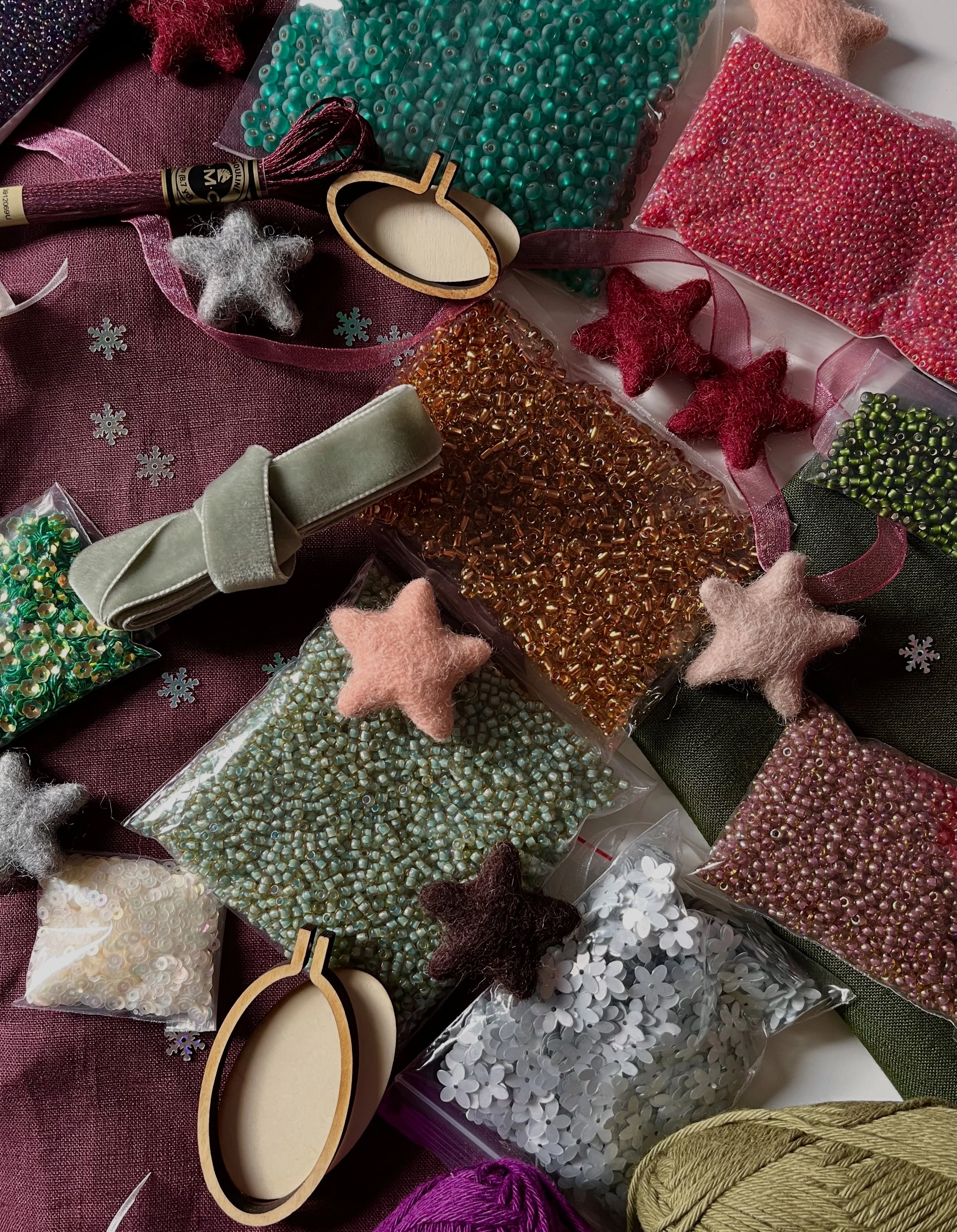 think curated bead palettes with a festive theme and full haberdashery boxes with beads, ribbons and fabrics all with a festive theme.